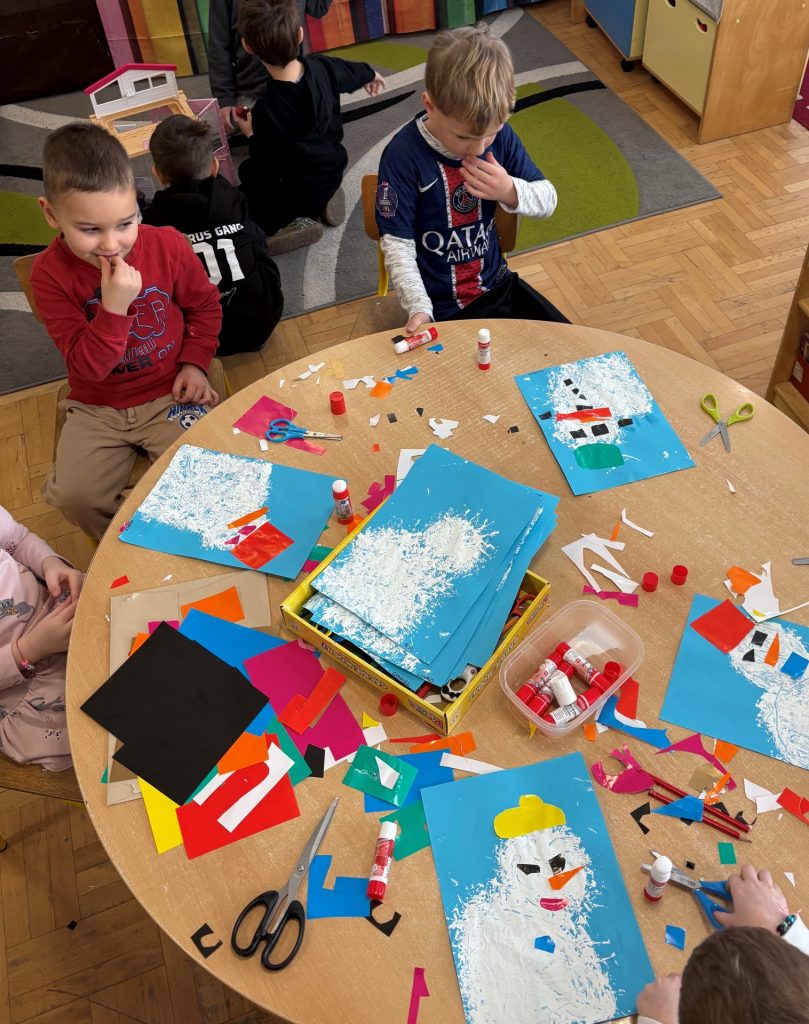 Odgojna skupina “Šapice” rado sudjeluje u individualnim i vođenim aktivnostima. Vježbamo finu motoriku razvijajući je kroz razne likovne aktivnosti: slikanje, točkanje, spajanje, rezanje, lijepljenje te izrađujemo i vesele snjegoviće.