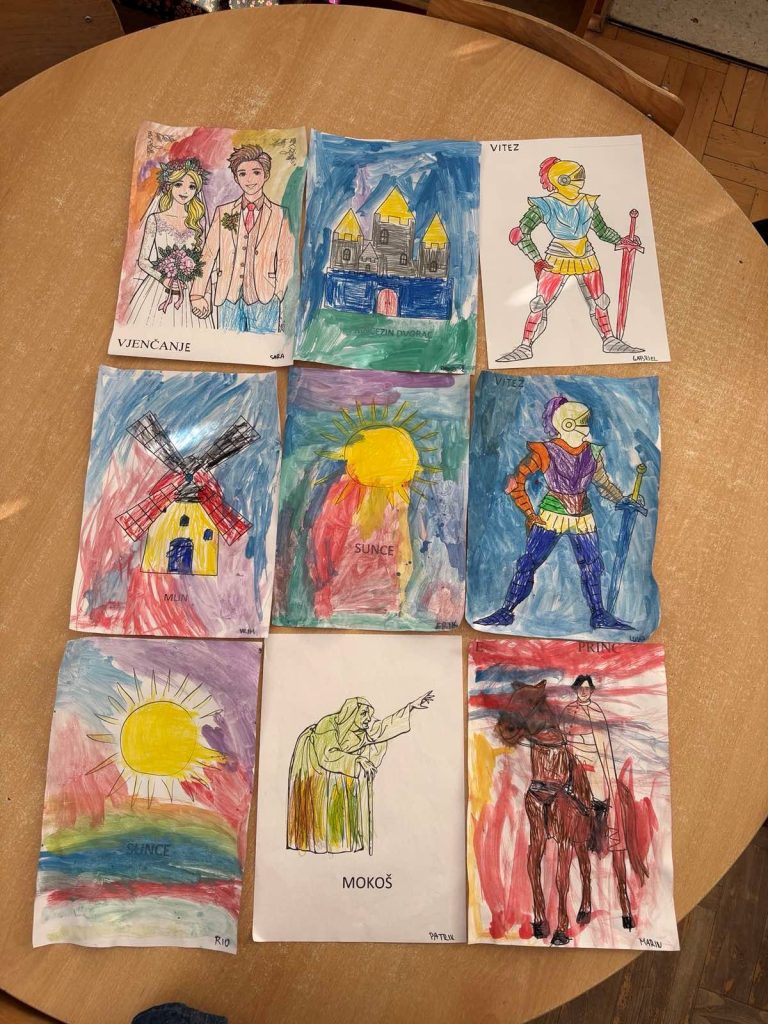 Središnja tema radionice bilo je Sunce te interaktivno pripovijedanje pojednostavljene verzije bajke „Sunce djever i Neva Nevičica“ Ivane Brlić-Mažuranić. Tijekom našega druženja djeca iz skupine „Šapice“ aktivno su sudjelovala u slušanju, pripovijedanju te komentiranju sadržaja bajke, a posebno su oduševila otvorenošću i kreativnošću promišljajući o značenju za njih složenih i nepoznatih riječi kao što su djever, mlin ili močvara. Zajedno s voditeljicama komentirali su likove iz priče te pokazali da s lakoćom prepoznaju njihove dobre i loše osobine te postupke. Radionica je protekla u ugodnom i dinamičnom raspoloženju, a pokazala je da i složenije bajke i priče mogu zainteresirati djecu mlađega uzrasta te biti dobar poticaj za razvijanje njihove bezgranične mašte.